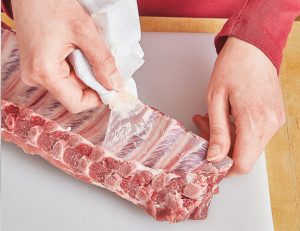 Start by removing the membrane from the back of the ribs. This can be done by loosening one end with a knife and then pulling it off with a paper towel for a better grip. Trim any excess fat and apply a generous amount of your chosen dry rub to both sides of the ribs. Allow the ribs to sit for at least 30 minutes to let the flavors penetrate.